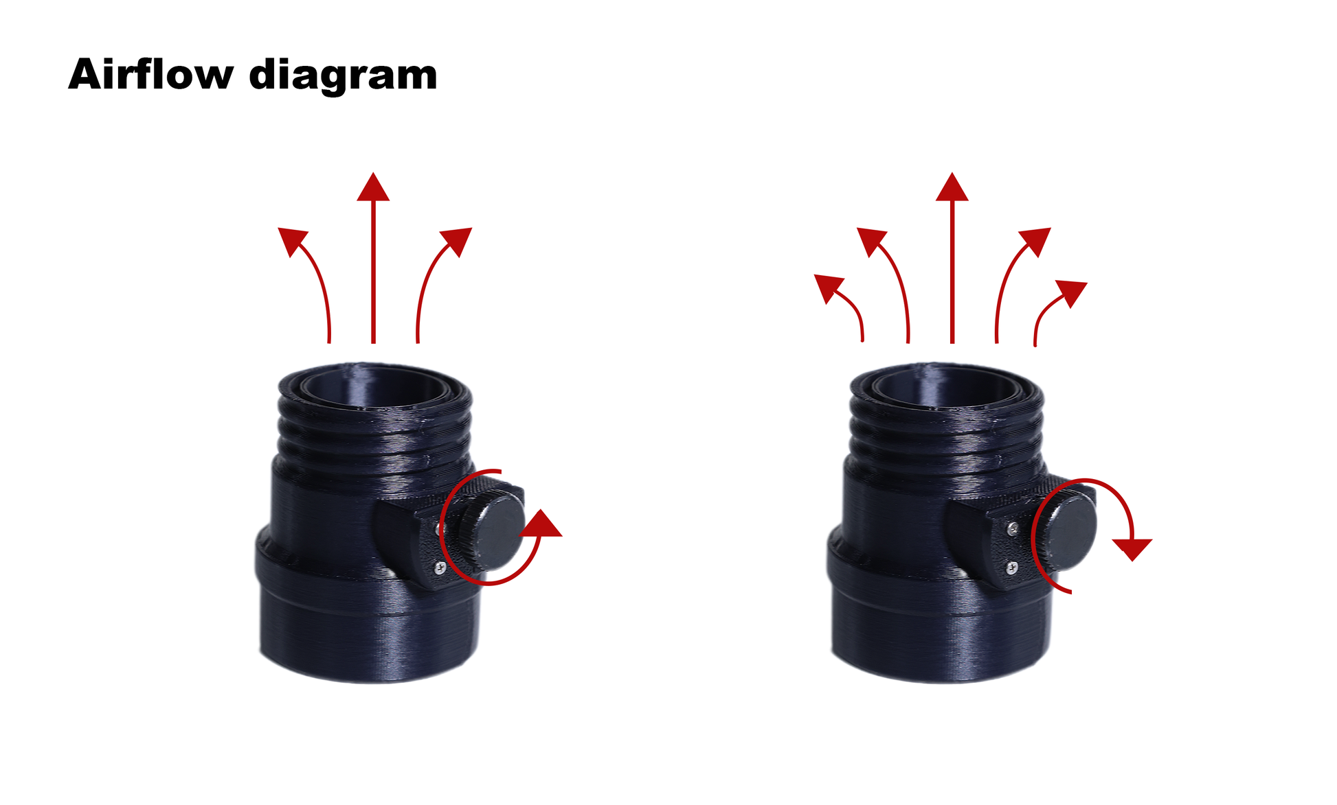 By rotating the knob on the air valve, you can control the amount of airflow. Turning it clockwise increases the amount of airflow. Turning it counterclockwise increases the amount of airflow. It can be used with any gas mask with an RD40 thread.